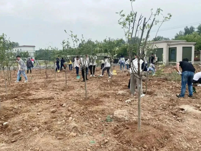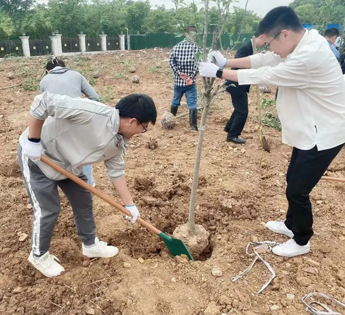 隨著植樹的逐漸熟練,管理干部們也自然而然地將標準化的思路融入到植樹活動中:先由指定人員集中完成土球除布條和挖坑工作,再由一人扶樹,3-4人一同埋土,僅需半分鐘,即可種好一棵樹。三百多棵樹很快如雨后春筍般林立了起來。