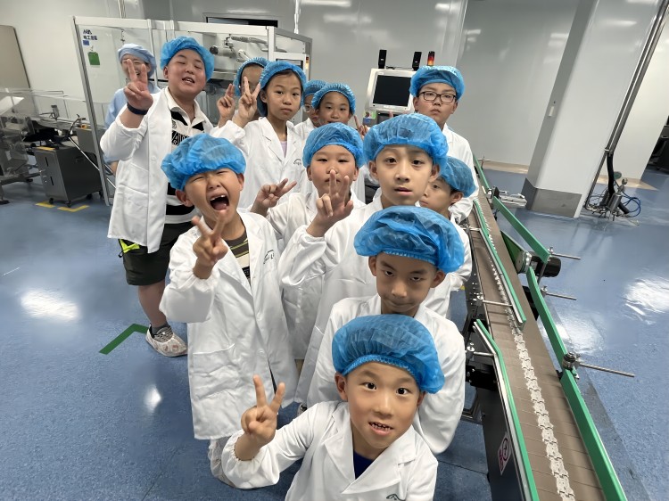 緊接著孩子們來到了小容量注射劑1號車間。在進入生產(chǎn)區(qū)的剎那,透過巨大的玻璃展窗,孩子們發(fā)出陣陣驚嘆——儲水罐猶如高大威猛的巨人,佇立在光亮整潔的制水間內(nèi)。注射液的誕生之路便從這里開始。在滅菌間內(nèi),孩子們對巨大的鐵柜子充滿了好奇,它就是飽和蒸汽滅菌柜,是藥支“蒸桑拿”的地方。孩子們在這里學習到了溫度與微生物之間的親密關系。在燈檢間內(nèi),巨大的星輪圓盤與隊列整齊的藥支們訴說著質(zhì)量第一的故事。最后,在包裝間內(nèi),從分托入托機到裝箱機,藥支們陸續(xù)穿上漂亮的服裝,成功誕生為完整的產(chǎn)品。孩子們了解到,每一支注射劑的誕生,都是科技與智慧的結晶,是保護人類健康的超級英雄。