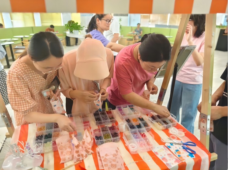 彩珠斑斕,猶如繁星點(diǎn)點(diǎn),在場(chǎng)的海陵員工精心挑選了自己心儀的珠子,以靈巧的雙手,將這些絢爛的彩珠編織成一條條獨(dú)一無二的手鏈。