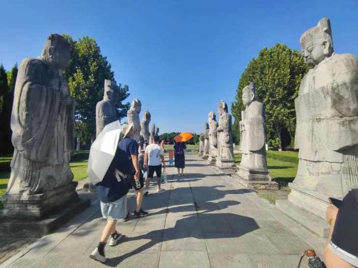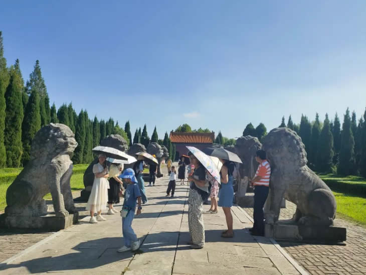 中午,大家在農(nóng)家樂品嘗了當(dāng)?shù)靥厣↓埼r,隨后坐車前往第二站明祖陵。這里被譽(yù)為全國唯一一座水下皇陵,承載了朱明興衰的塵煙。工匠與家屬們漫步在陵墓神道之上,在講解聲中觀察幾百年前的石刻群像,體會(huì)其中的歷史余韻與時(shí)代遺音。石像歷經(jīng)幾百年時(shí)光仍然細(xì)節(jié)豐富、栩栩如生,然而六朝舊事隨流水,百年帝業(yè)亦成空。